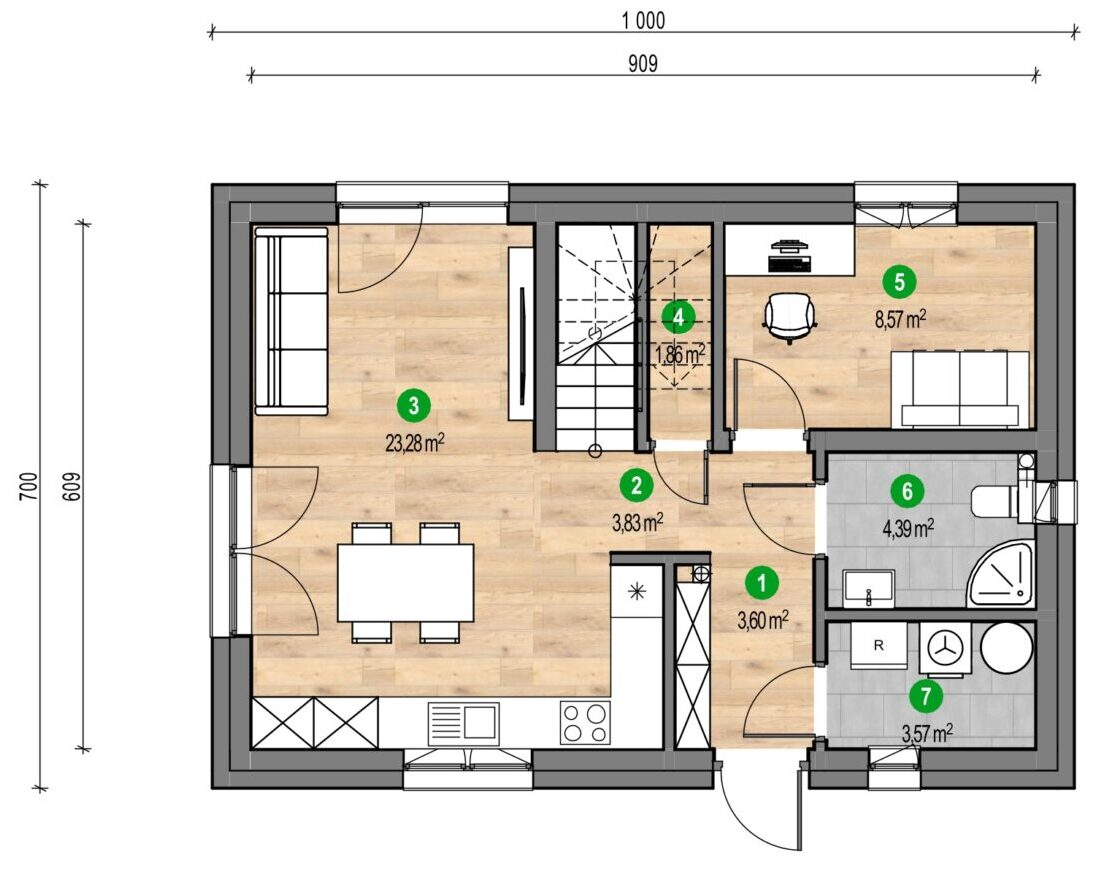 Na prízemí sa nachádza priestranná obývacia izba prepojená s jedálňou a otvorenou kuchyňou – priestor, ktorý podporuje spoločné trávenie času a prirodzenú integráciu celej rodiny. Z obývačky vedie pohodlný výstup na terasu, ktorá je ideálnym miestom na letné posedenia či rodinné oslavy.