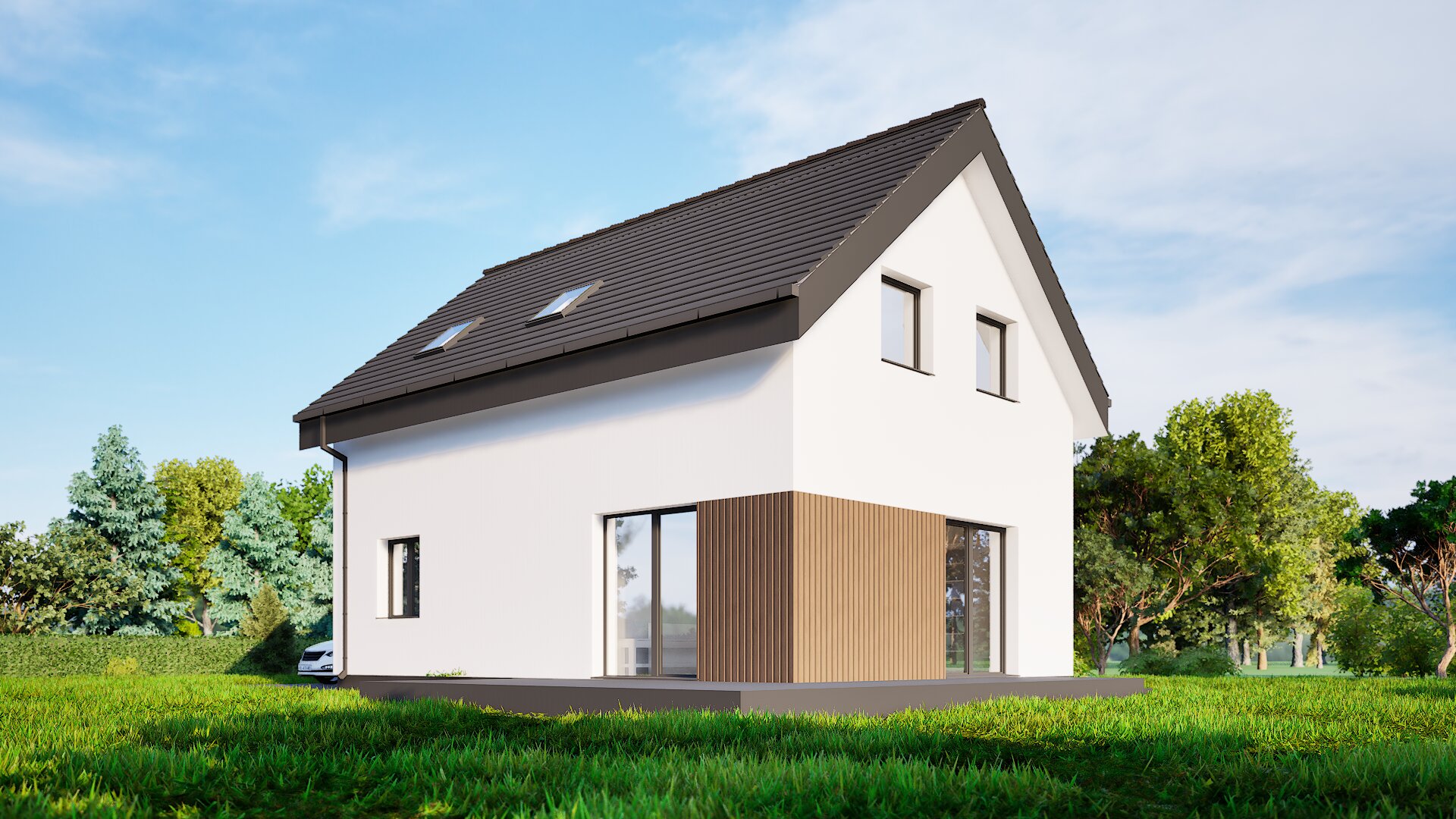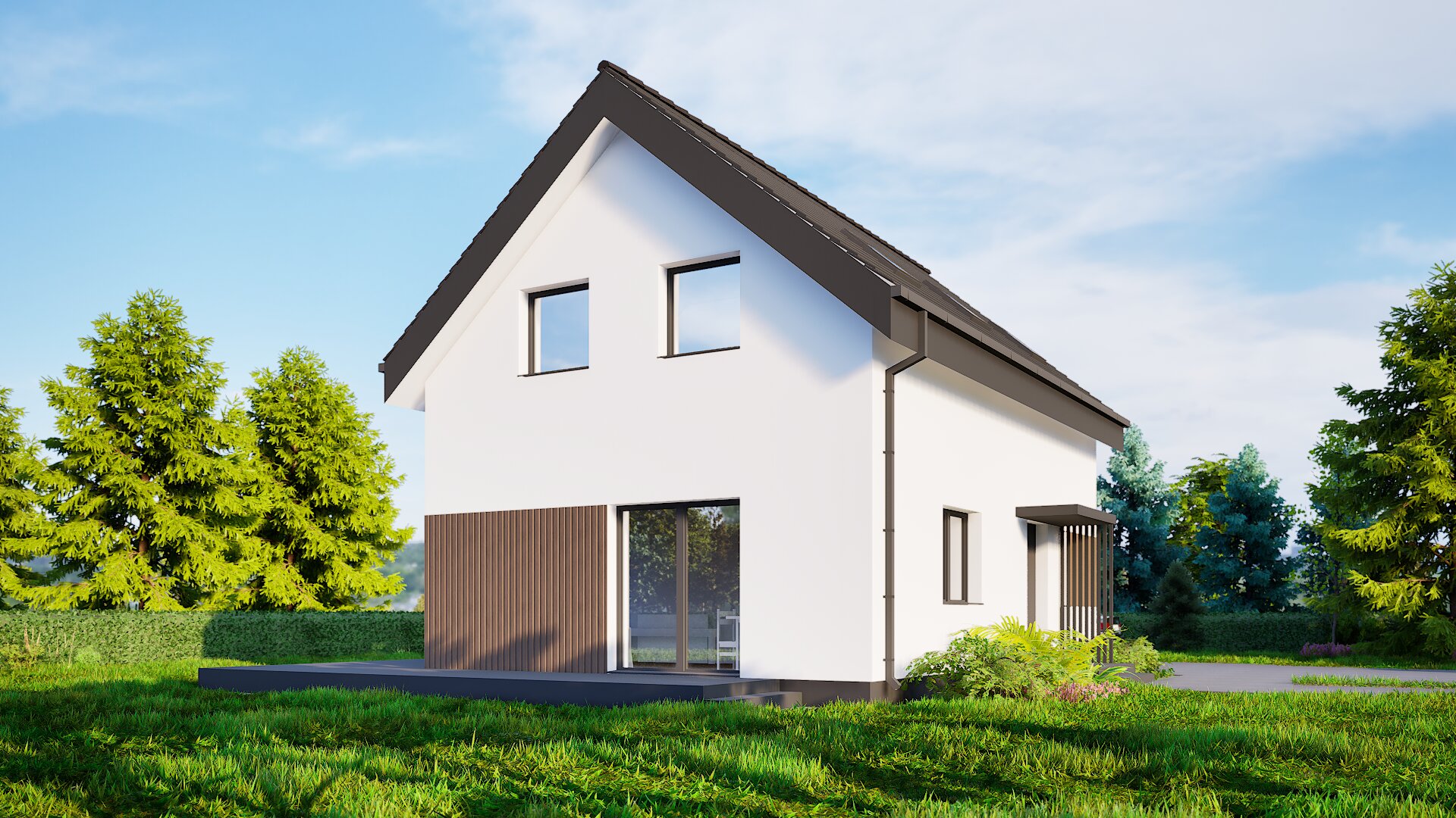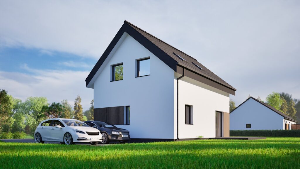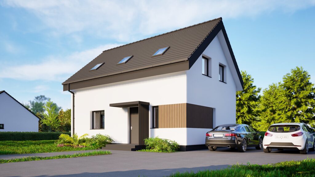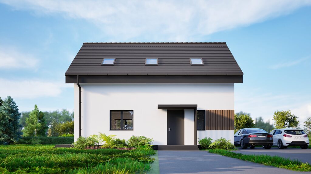 Jednoduchá sedlová strecha a minimalistické detaily fasády dodávajú domu elegantný vzhľad a zároveň zaručujú nenáročnú údržbu. Tento dom je skvelou voľbou pre rodiny, ktoré chcú spojiť tradičnú formu s moderným štýlom bývania.