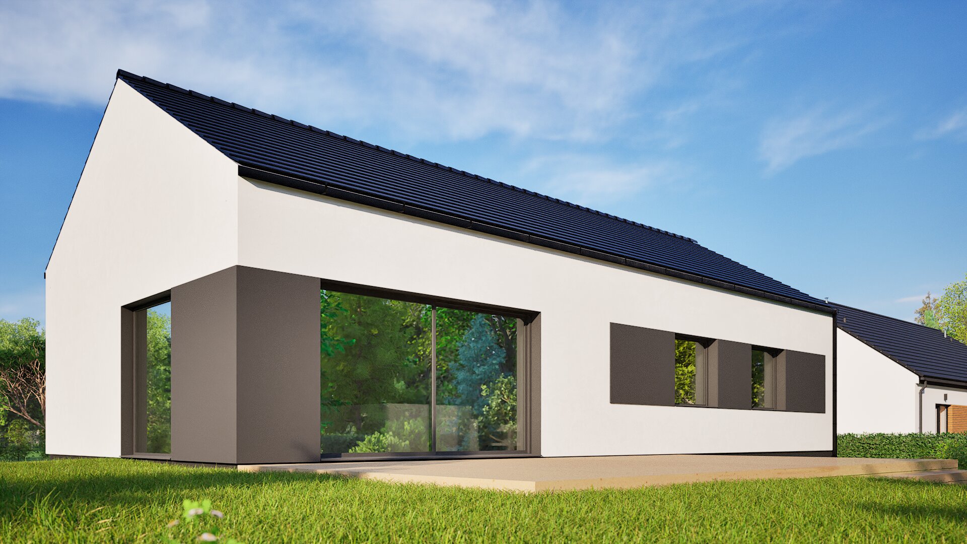 Tento projekt predstavuje moderný rodinný dom s minimalistickou architektúrou, ktorého čisté línie dopĺňa klasická sedlová strecha. Tá nielen podčiarkuje estetiku, ale zároveň zjednodušuje výstavbu a následnú údržbu. Svetlá fasáda s tmavými akcentmi okolo okien pôsobí elegantne a súčasne. Veľké okná prinášajú do interiéru množstvo prirodzeného svetla a poskytujú panoramatické výhľady do záhrady a okolia.