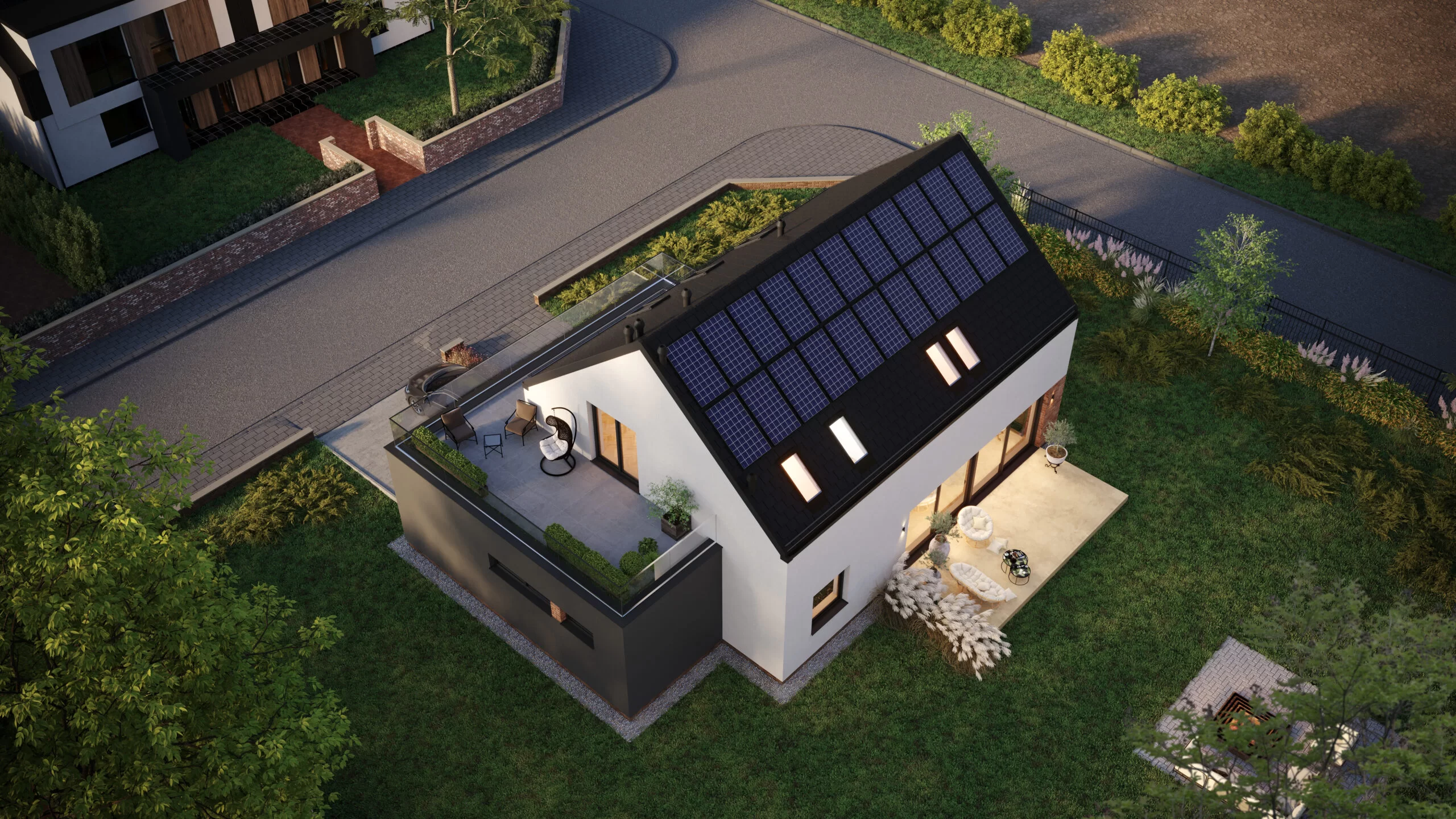 Nad prázdnym priestorom sú umiestnené dva strešné okná – dodatočný zdroj denného svetla v tejto časti domu. Obývacia izba je osvetlená popoludňajším svetlom vďaka ďalším veľkým preskleniam – štyri moderné posuvné okná spájajú túto zónu s veľkou terasou a zeleňou záhrady.