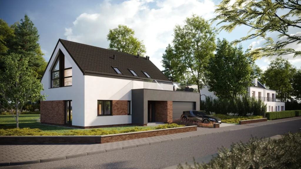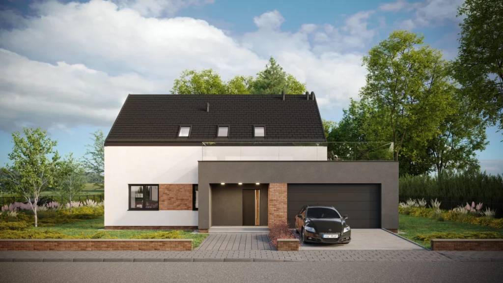 Projekt rodinného domu Triathlon s modernou hmotou a sedlovou strechou. Budova zvonku upútava pozornosť architektonickým dizajnom zodpovedajúcim aktuálnym trendom. Charakter fasády vytvárajú kombinácia bielej a sivej omietky s klinkerovou tehlovou dlažbou, tmavohnedá keramická strešná krytina a grafitové detaily a sklenená zábradlie na hornej terase.