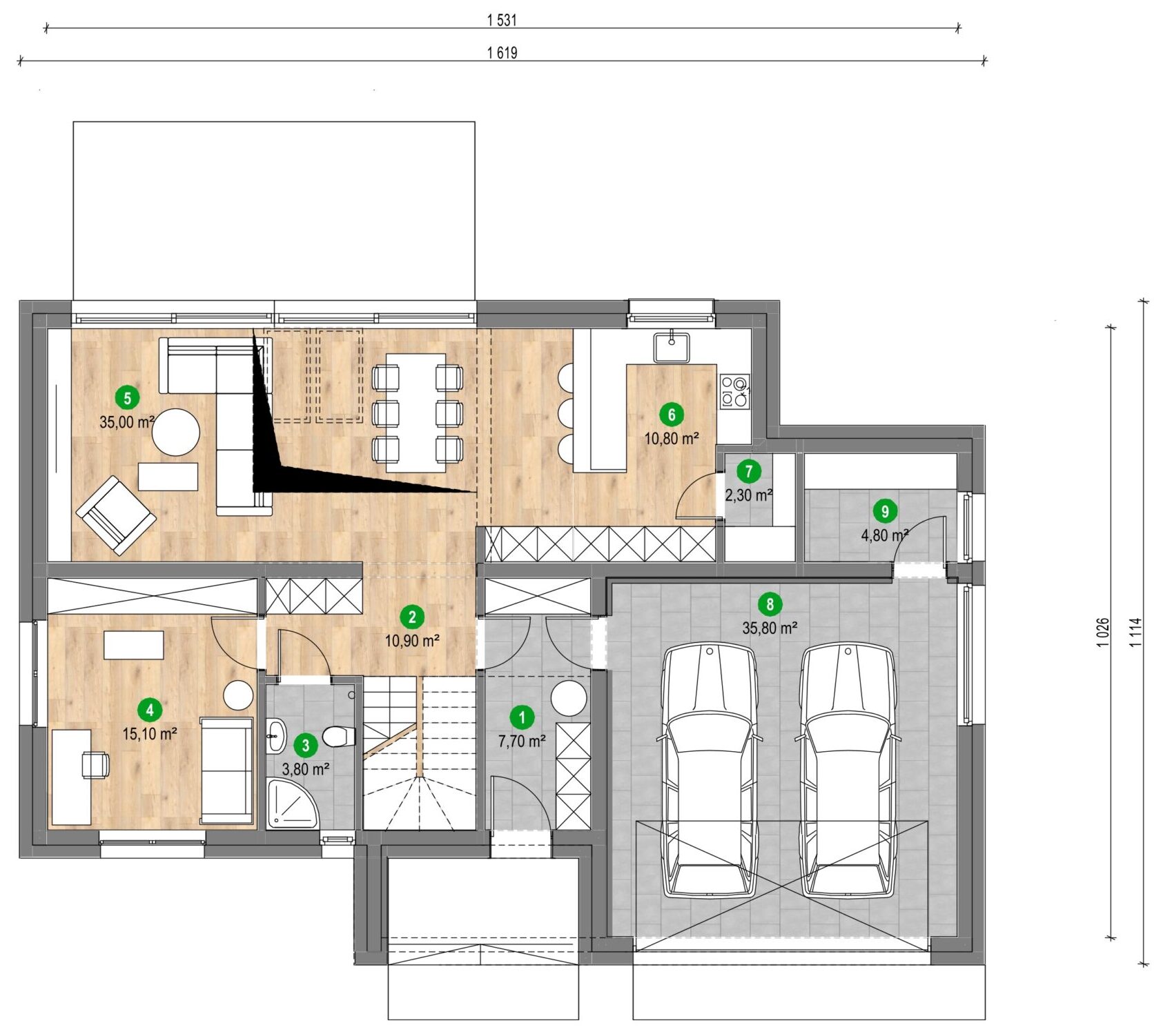 Wiatrołap: 4,68 m2 Pralnia: 5,71 m2 Gabinet: 9,14 m2 Łazienka: 5,23 m2 Salon z kuchnią: 53,86 m2 Komunikacja: 12,93 m2 Garaż: 23,86 m2 Powierzchnia: użytkowa 115,41 m2; podłóg: 116,90 m2