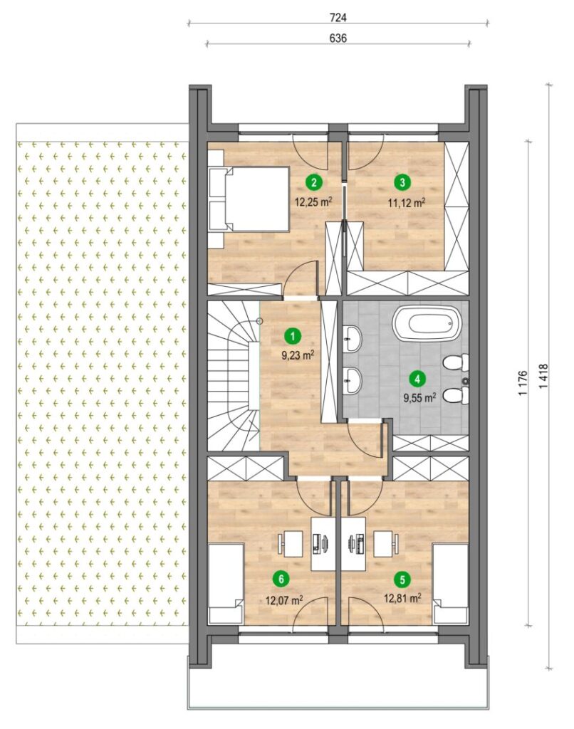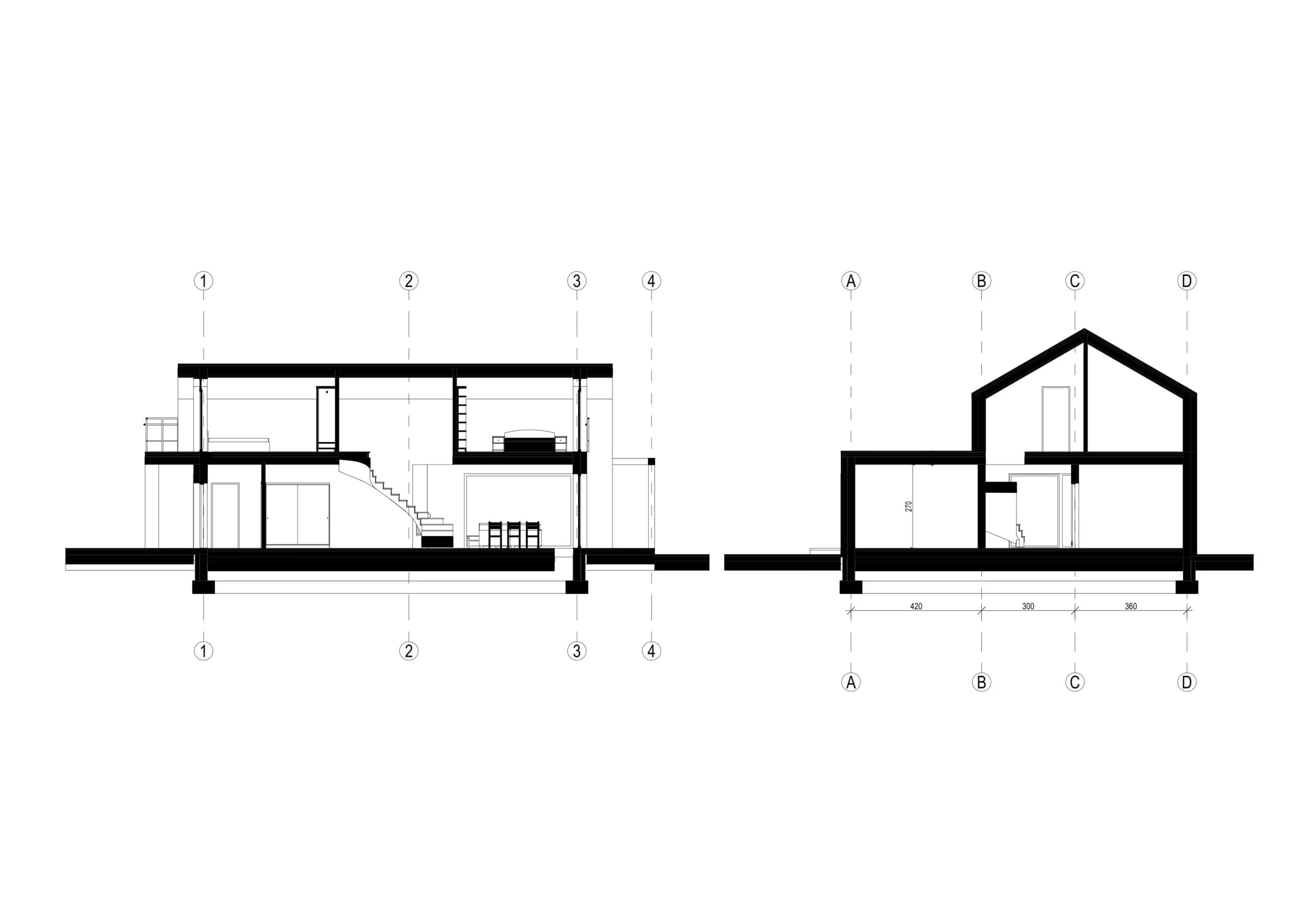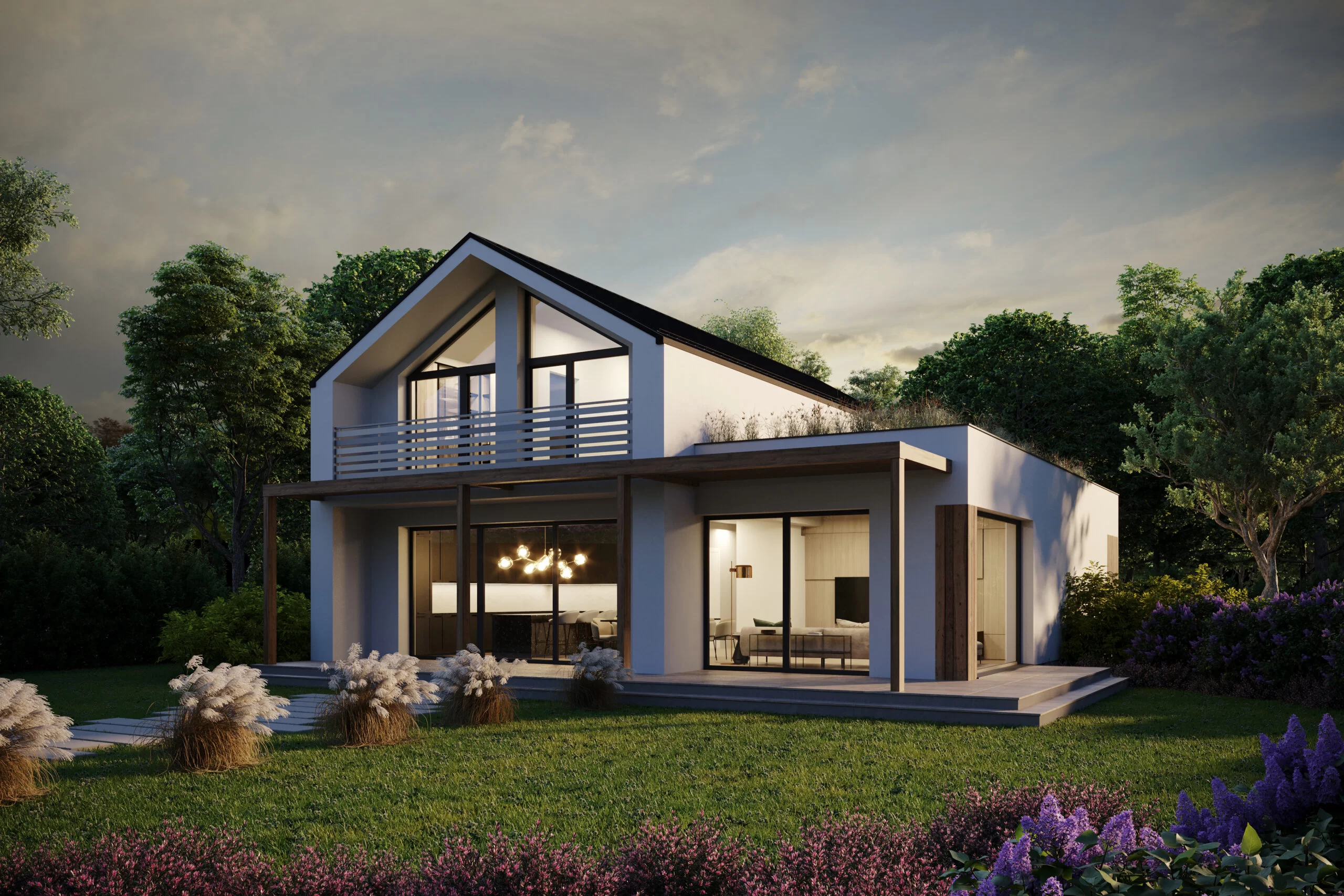 Moderný rodinný dom, ktorého výmera a veľké presklenia vo frontálnej a záhradnej fasáde zabezpečujú pohodlie a uchvacujú pocitom priestoru. Viac ako 50 m2, otvorená zóna obývacej izby, kuchyne a jedálne sa plynule spája s priestorom terasy a záhrady. Časť hmoty domu má obytné podkrovie so sedlovou strechou. Na západnej strane, nad garážou a časťou obývacej izby, je navrhnutá plochá, zelená strecha. Tieto dva fragmenty hmoty budovy spája pergola s ľahkou konštrukciou zo svetlého dreva, nad terasou. Estetické hodnoty budovy dopĺňajú materiály použité na fasádach – imitácia svetlého dreva, antracitový plech na streche a antracitové okenné rámy a dvere.