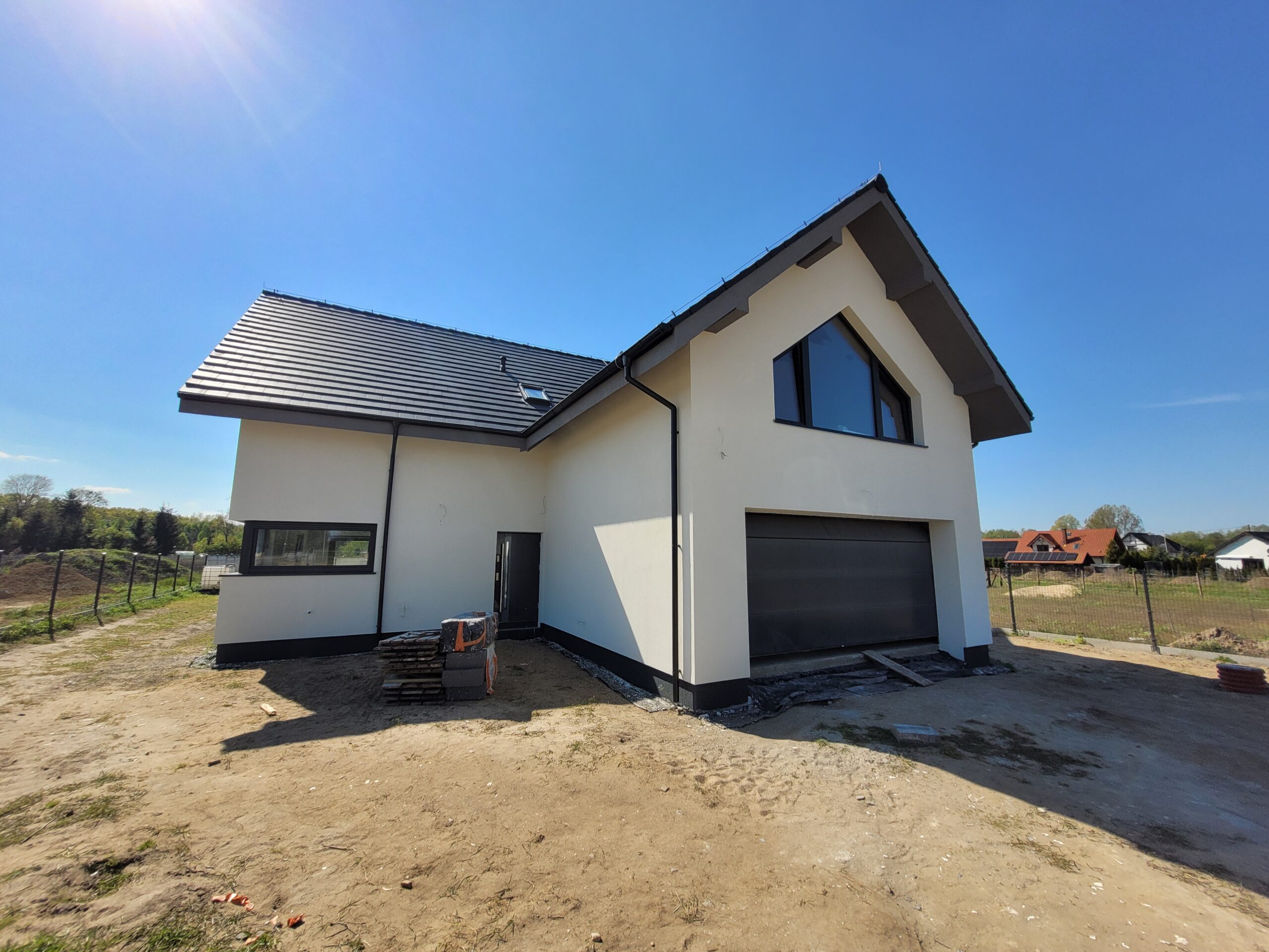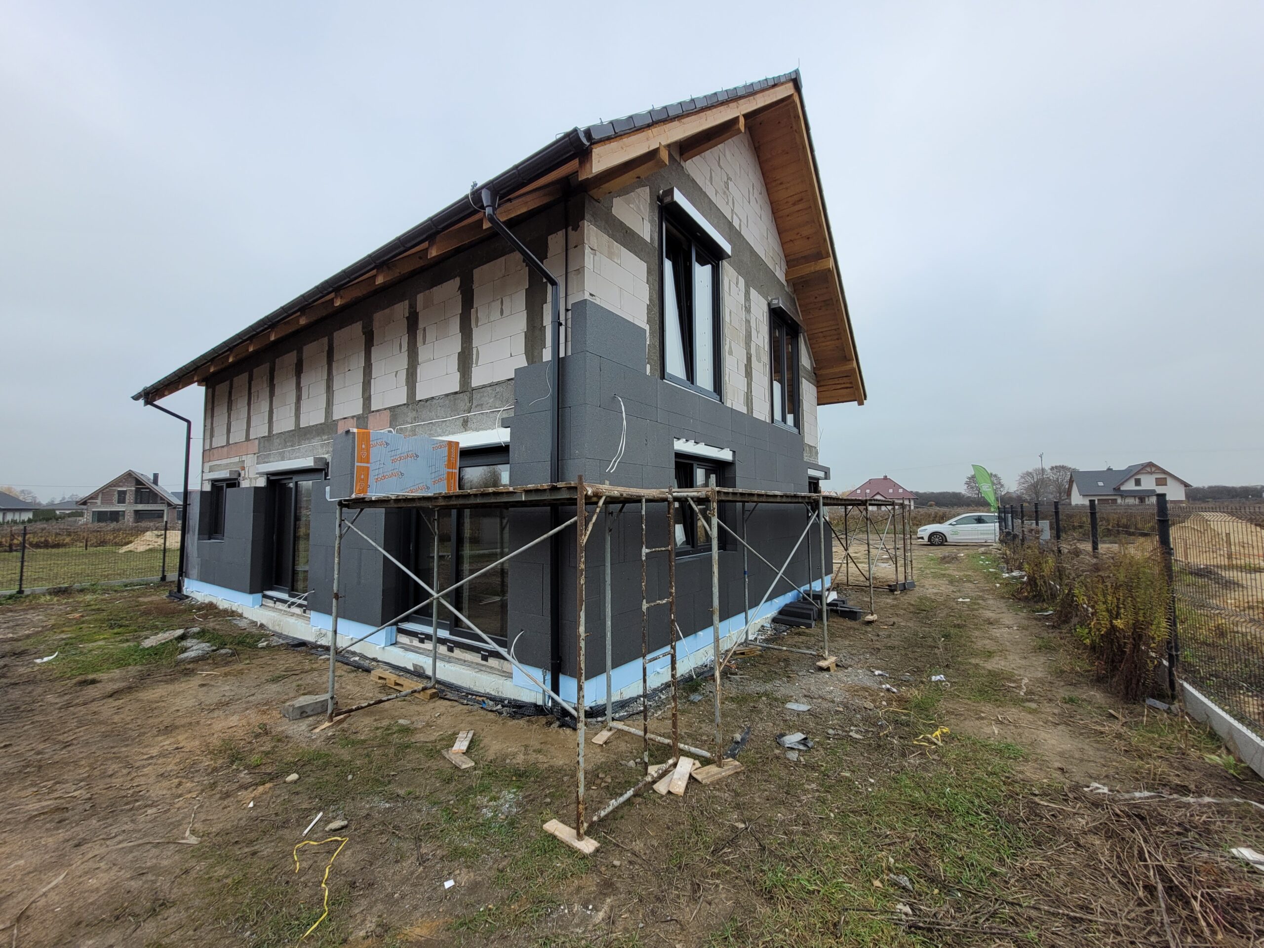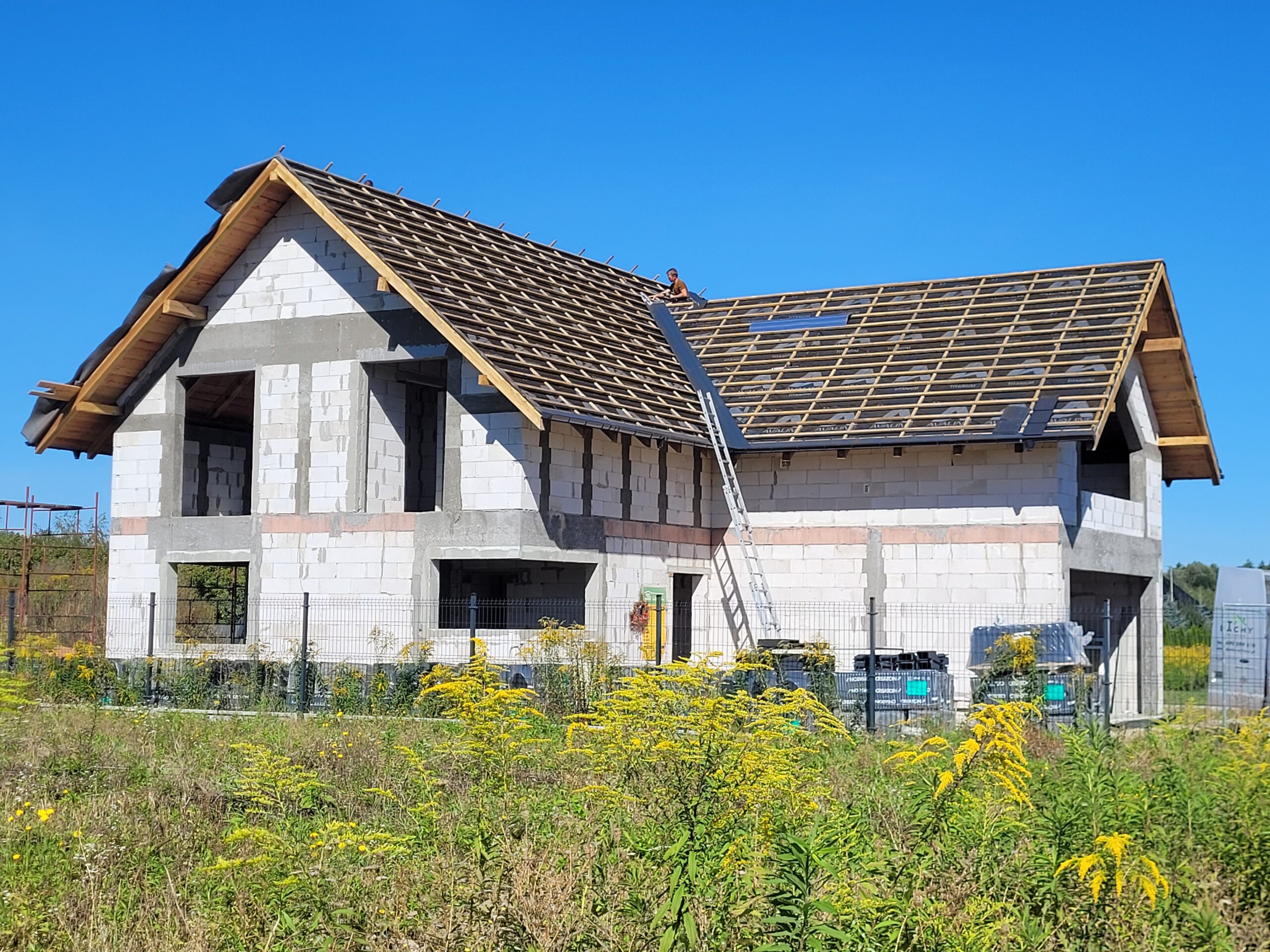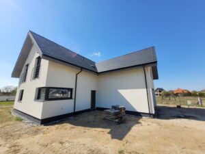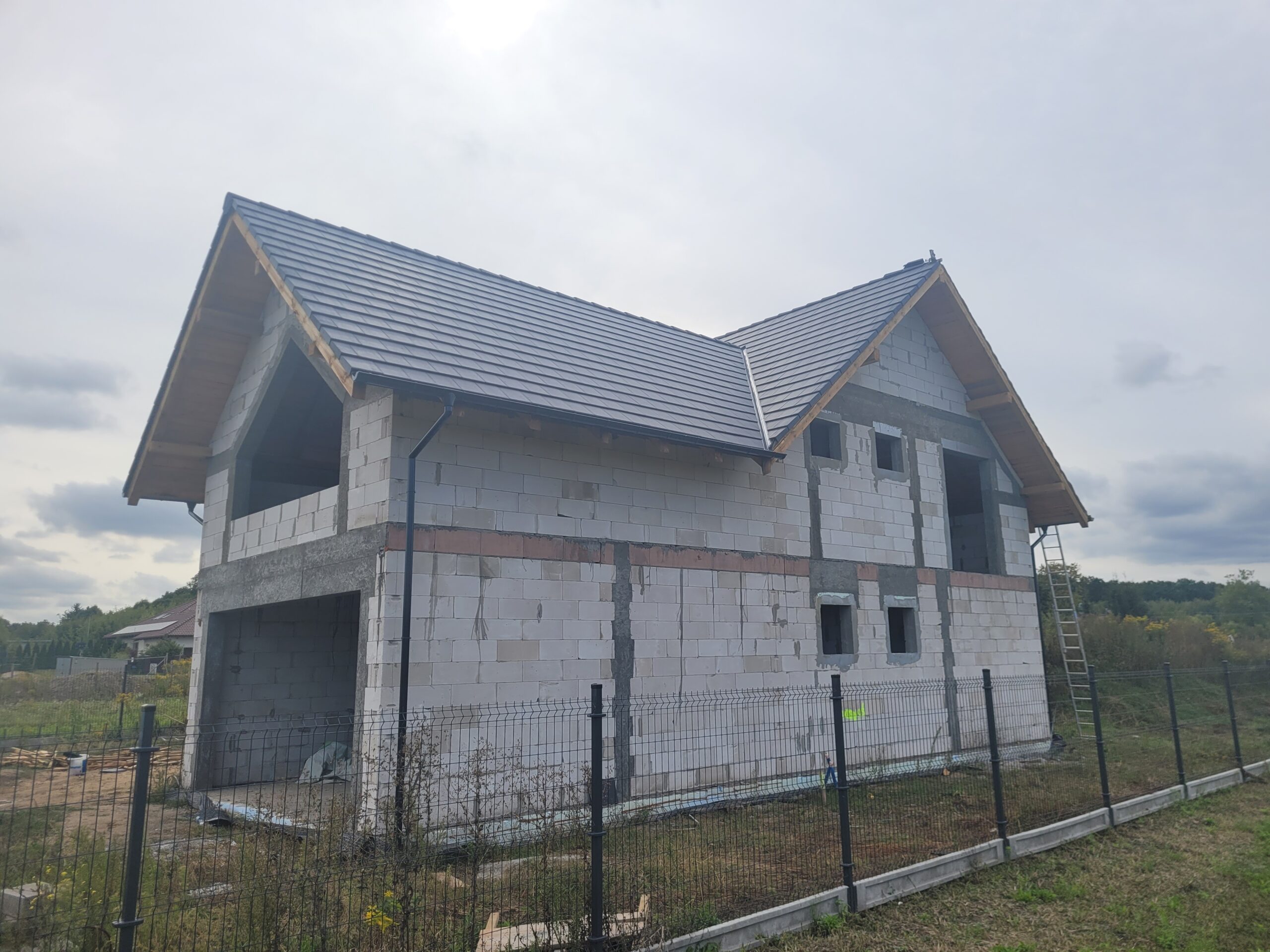 Dom o powierzchni 196 m² został zbudowany na tradycyjnych fundamentach, składających się z żelbetowych pasów i murów fundamentowych. Nośne i działowe ściany wykonano z betonu komórkowego o grubości odpowiednio 24 cm i 12 cm. Konstrukcja dachu została zrealizowana w sposób tradycyjny, zgodny z projektem. Dach pokryto płaską dachówką ceramiczną Creaton Simpla w antracytowo-szkliwionym odcieniu.