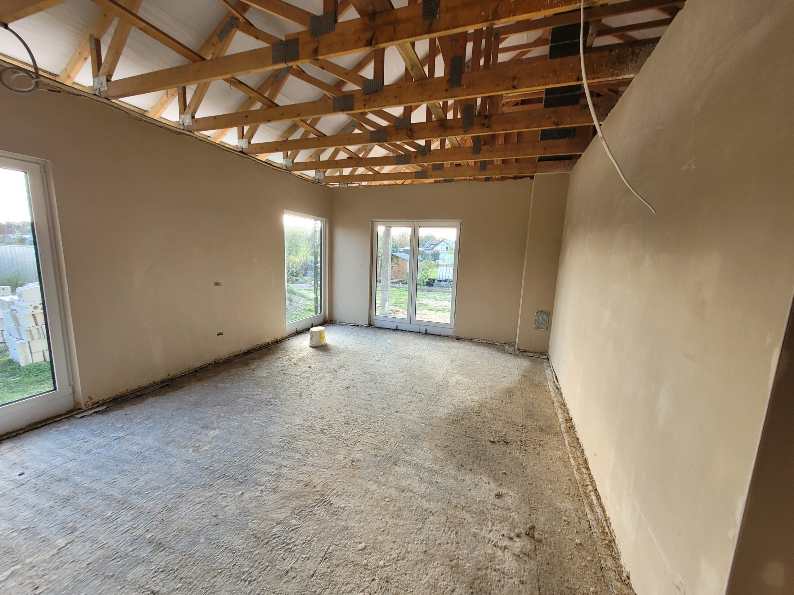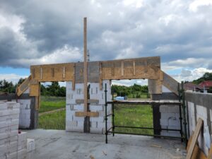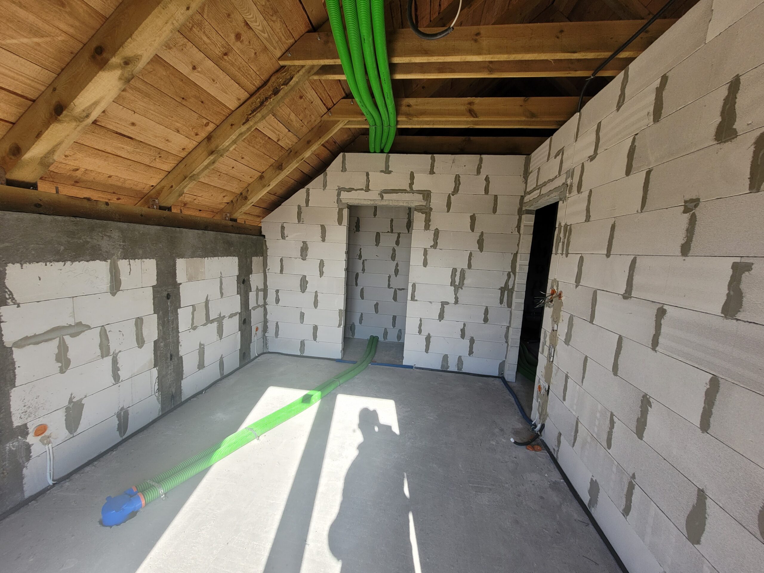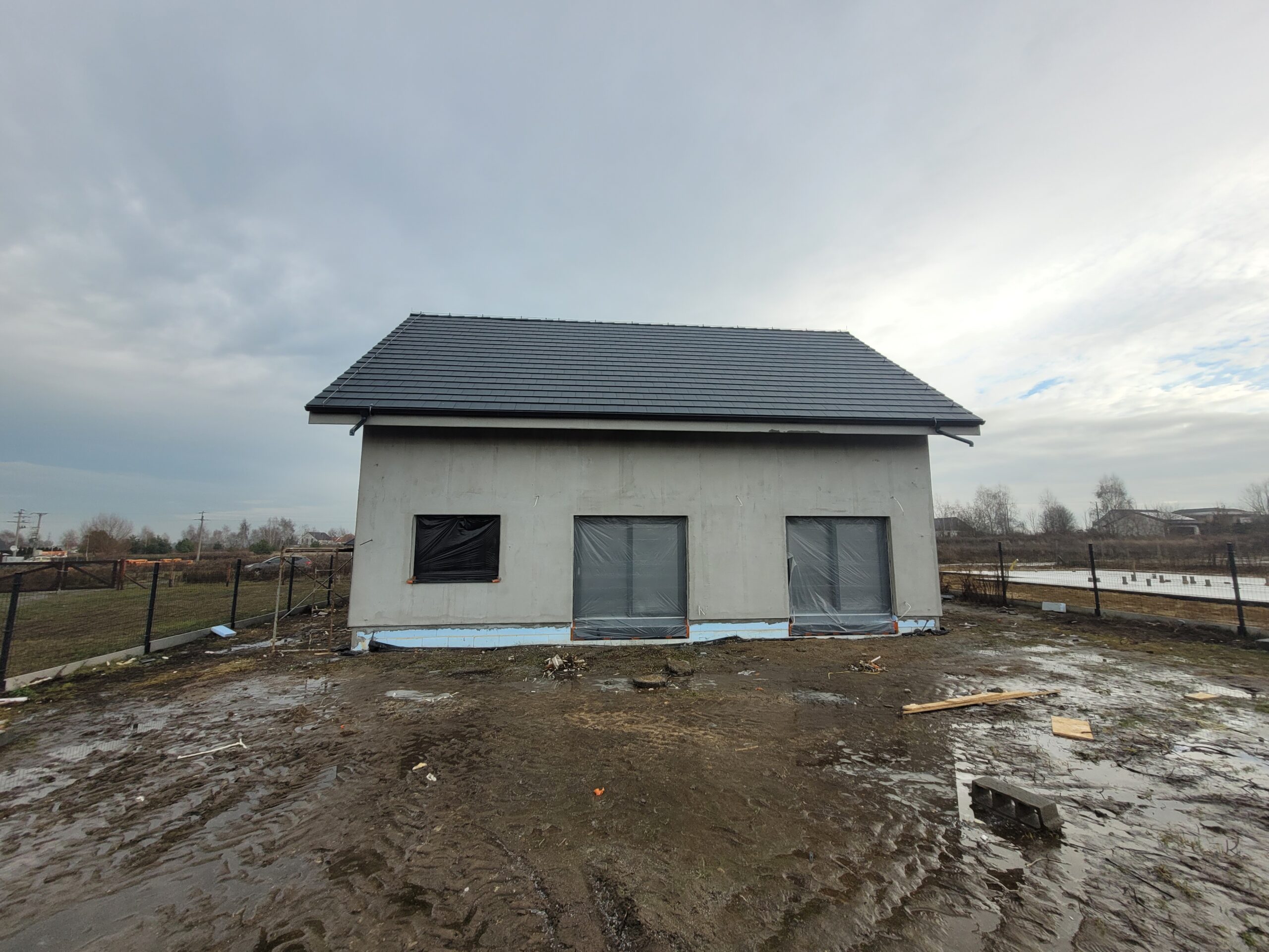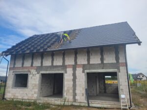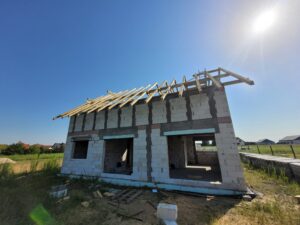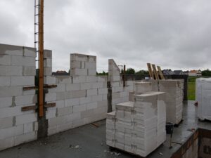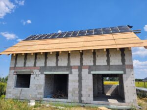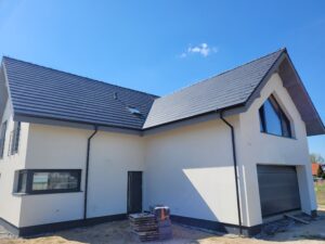 Dom o powierzchni 196 m² został zbudowany na tradycyjnych fundamentach, składających się z żelbetowych pasów i murów fundamentowych. Nośne i działowe ściany wykonano z betonu komórkowego o grubości odpowiednio 24 cm i 12 cm. Konstrukcja dachu została zrealizowana w sposób tradycyjny, zgodny z projektem. Dach pokryto płaską dachówką ceramiczną Creaton Simpla w antracytowo-szkliwionym odcieniu.