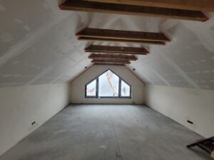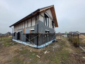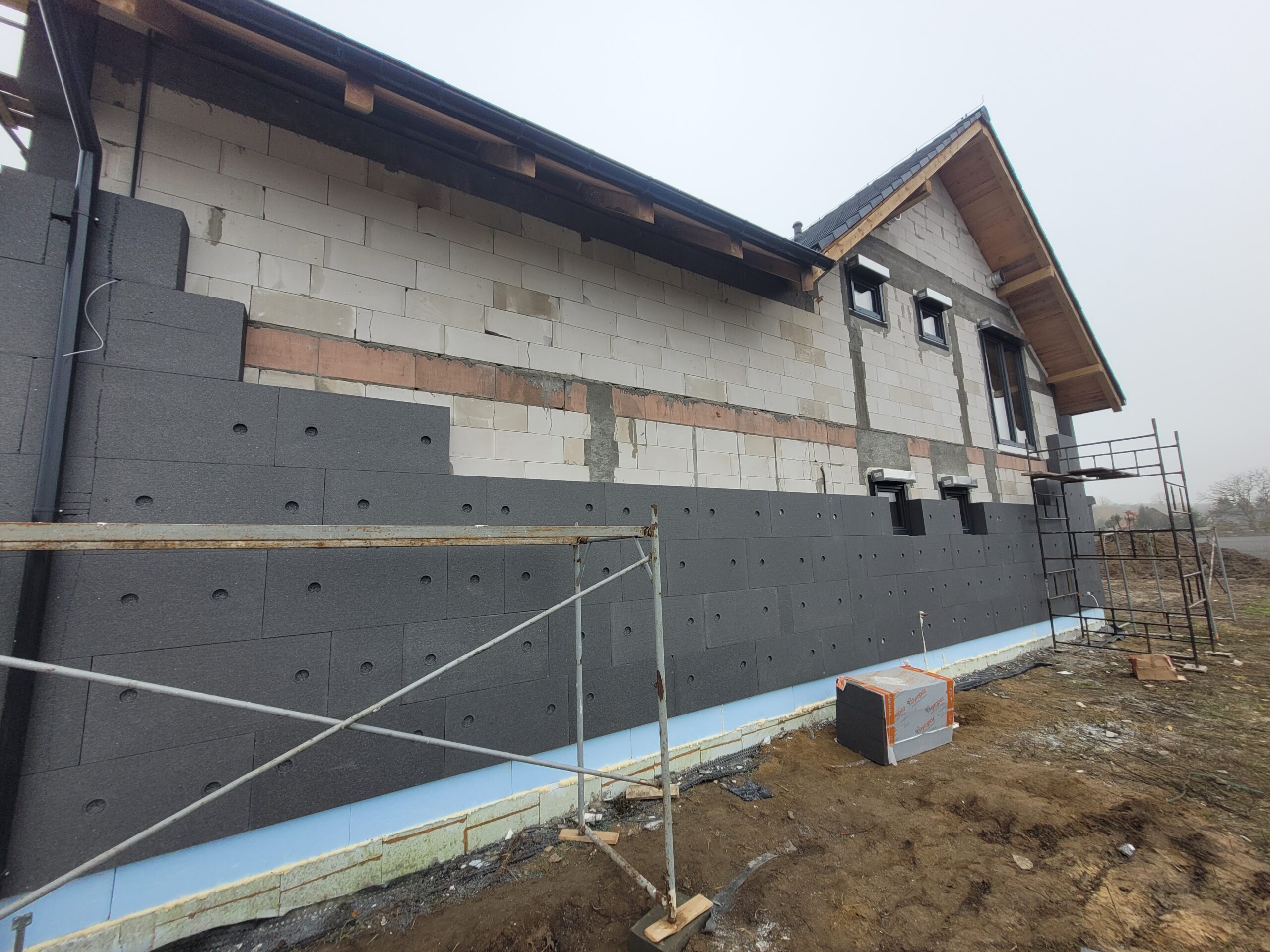 Ocieplenie poddasza wykonano za pomocą pianki PUR o grubości 25 cm, a ściany zewnętrzne pokryto grafitowym styropianem o grubości 20 cm. Do wykończenia elewacji budynku wykorzystano tynk silikonowy w jasnoszarym kolorze.